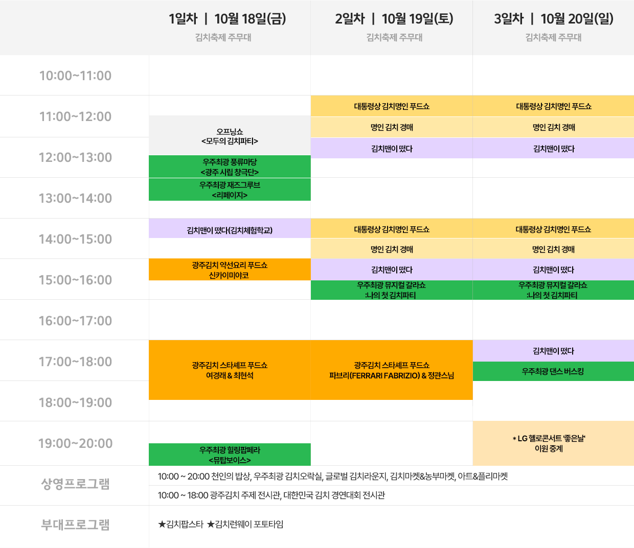 일시2024. 10. 18.(금) ~ 10. 19.(토) / 금요일 2회, 토요일 1회장소광주광역시청 주무대참가셰프페라리 파브리치오, 정관스님, 최현석, 여경래, 신카이 미야코내용- 광주김치에 대한 국내외 스타셰프 5인의 다양한 해석을 생생하게 경험할 수 있는 쿠킹 라이브쇼- 대통령상을 수상한 김치명인의 김치와 다국적 요리 스타일이 결합된 색다른 김치요리 레시피 공개- 푸드쇼 관람 후 음식 시식행사