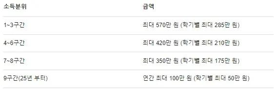 (학기별 Ⅰ유형- 50만 원, 다자녀- 첫째?둘째(67만5천 원), 셋째 이상(100만 원))
