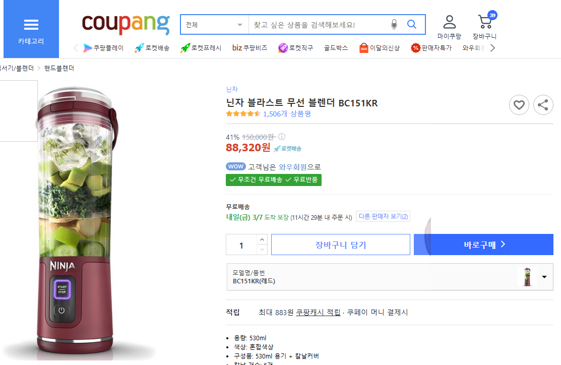 현재 별점 4.7점, 리뷰 1506개를 가진 닌자 블라스트 무선 블렌더 BC151KR! 지금 쿠팡에서 더 저렴하고 다양한 핸드블렌더 제품들을 확인해보세요.