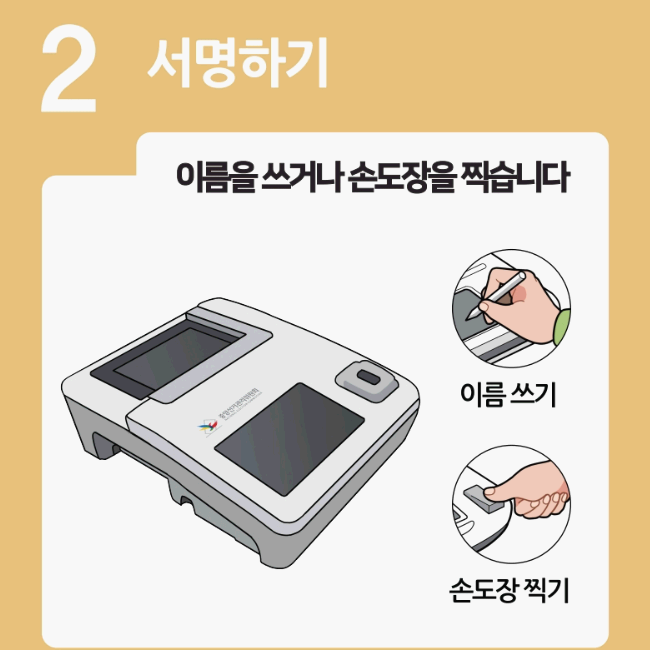 전자서명(손도장 또는 서명)을 하고, 투표용지를 받습니다 .