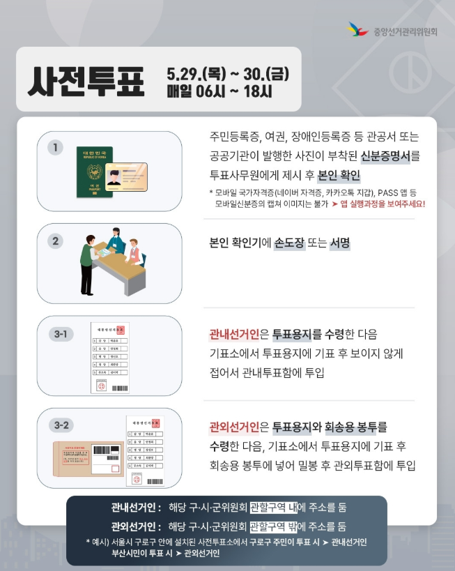 사전투표는 5월 29일(목)~30일(금), 오전 6시부터 오후 6시까지 이틀간 진행됩니다.