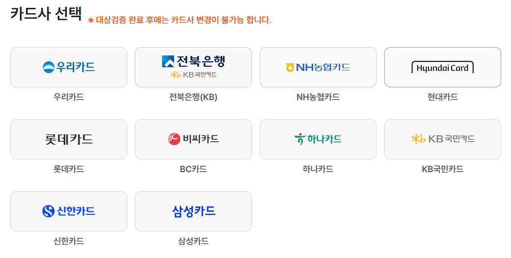 - 적립 카드: 본인이 선택한 신용/체크카드 (국민, 농협, 롯데, BC, 삼성, 신한, 우리, 하나, 현대)