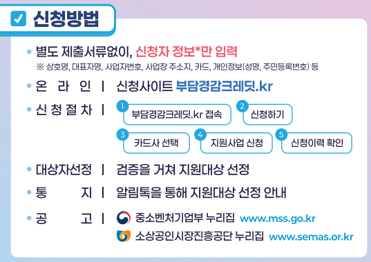 신청은 매우 간편합니다. 소상공인24 공식 홈페이지 (부담경감크레딧 또는 소상공인24 검색)에 접속하여 온라인으로 진행됩니다. 별도의 복잡한 서류 제출 없이, 사업자용 공동인증서로 로그인하고 사업자번호를 입력하면 국세청 데이터와 자동 연동되어 지원 대상 여부가 즉시 판별됩니다.
