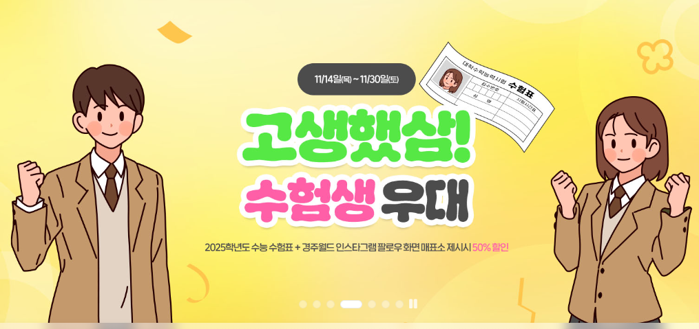 ➀ 방문일 당일 매표소 현장 결제 시 수능 수험생 본인 입장권 50% 할인(성인 1인 현장 구매가 기준), 동반인 30% 할인(동반인 최대 4명까지, 본인 포함 총 5명 현장 할인)