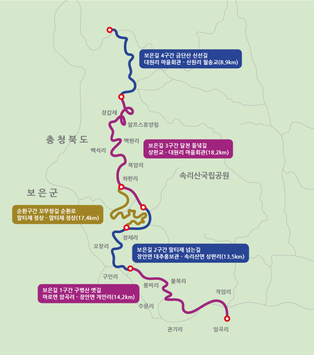 보은 말티재에는 여러 하이킹 코스가 마련되어 있습니다. 초보자부터 숙련자까지 모두 즐길 수 있는 다양한 난이도의 코스가 있습니다. 예를 들어, 8.9km, 18.2km, 17.4km의 코스가 있으며, 각 코스는 명확하게 표시되어 있어 길을 잃을 염려가 없습니다.