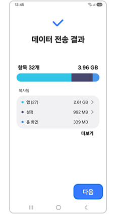 4단계) 이전 휴대전화에서 연결을 허용하고 가져올 데이터 선택 후 다음을 눌러 전송하세요.