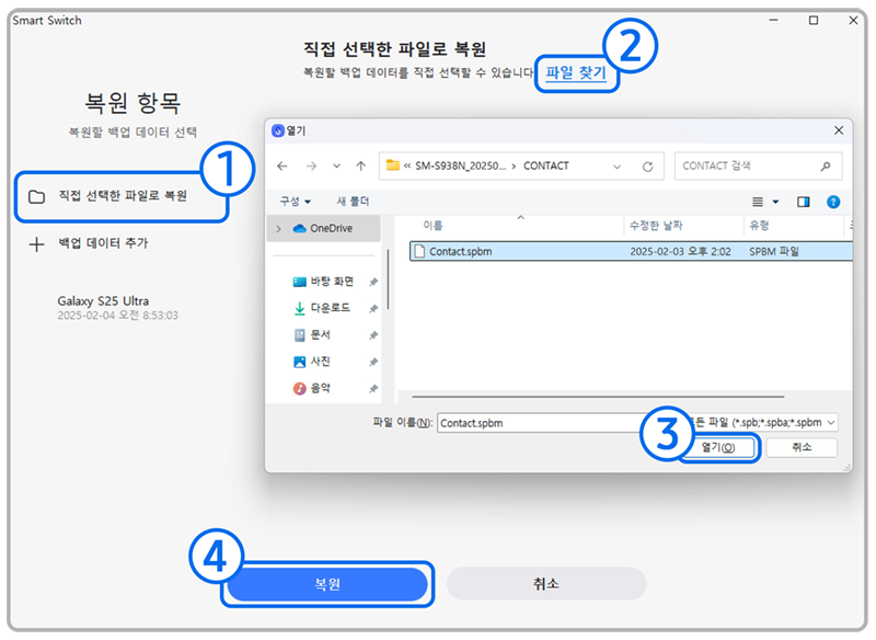 | ① 스마트 스위치(Smart Switch) 실행 | ② SD카드 아이콘 선택 | ③ SD카드 복원 데이터 선택 | ④ 복원할 데이터 선택 후 다음 |