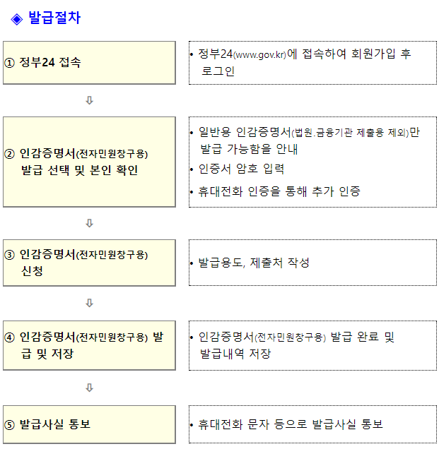 • 일반용 인감증명서 중 법원․금융기관에 제출하는 용도가 아닌 인감증명서는 전자민원창구(정부24)에서 발급 가능 |