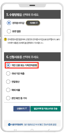 - 서류 선택: 앱 내에서 발급하고자 하는 서류를 선택합니다. 예를 들어, 가족관계부를 선택할 수 있습니다.