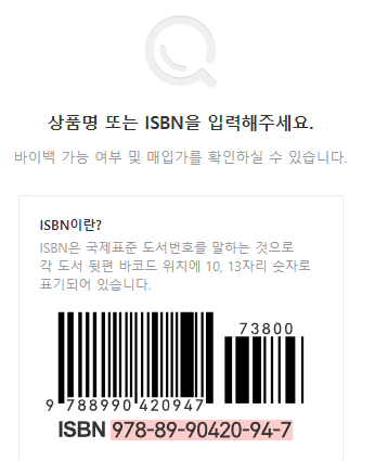 - 판매할 중고상품의 상품명이나 ISBN(책 뒷면 바코드 아래의 숫자)으로 검색하여 신청해 주세요.