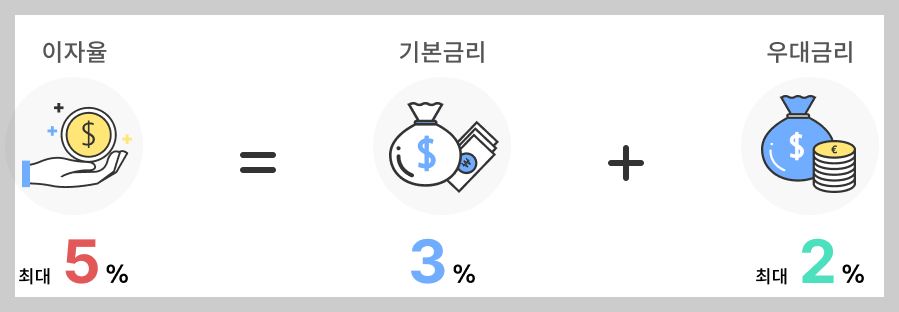 기본 금리는 3%이며 우대 금리를 최대 2%까지 추가로 받을 수 있어 연 최고 5%의 금리가 적용됩니다.