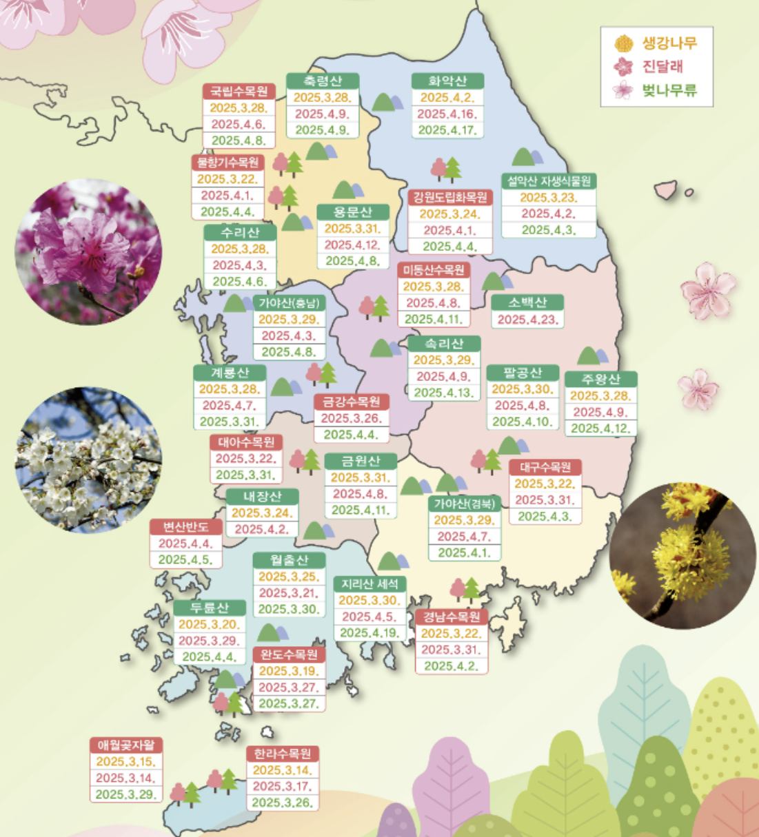 산림청 뉴스에 따르면, 2025년 올해 봄꽃의 개화 시기는 작년보다 조금 늦어질 것으로 관측된다고 합니다.
